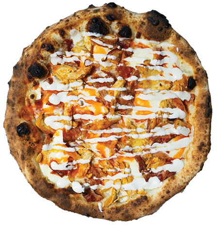 Housemade white sauce, fresh mozzarella, cage free, non-GMO buffalo chicken & applewood smoked bacon, blue cheese dressing + Texas Pete drizzle