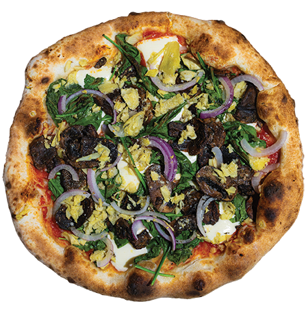 Housemade red sauce, fresh mozzarella, baby spinach, artichoke hearts, red onions, mushrooms, sea salt & EVOO